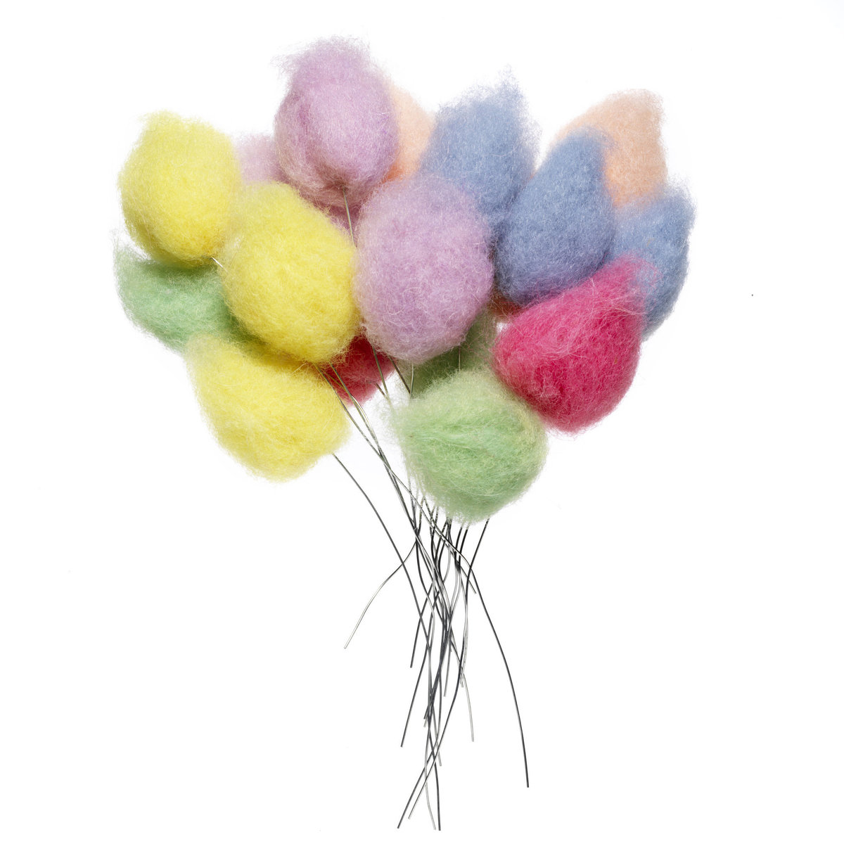 Dekorasjon til påskeris i ulike farger, for påskeriset blir enda finere når du surrer fast store, lodne kuler, ikke sant? Pakken inneholder 18 polyesterkuler i ulike farger, som er limt fast på et stykke ståltråd. Fargene går naturligvis i påskens og vårens nyanser! Lengden varierer mellom 16 og 18 cm inklusive ståltråd.