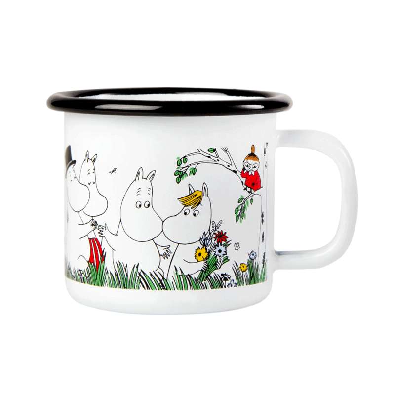 Emaljekrus med Mummi motiv av den glade mummifamilien som rommer 1,5 dl.