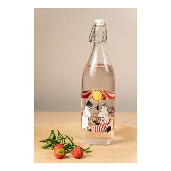 Glassflaske med Mummi Sommer motiv som rommer 1 L.
