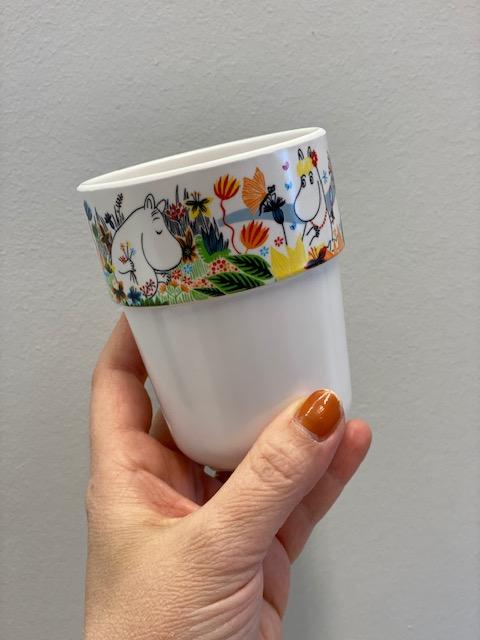 Fin mummikopp i melamin med motiv av mummikarakterene Mummitrollet og Snorkfrøken