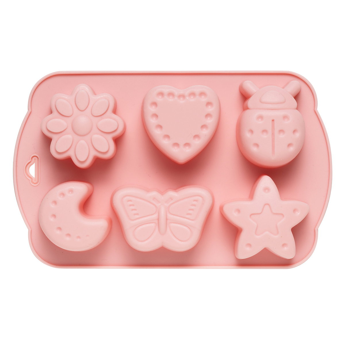 6 forskjellige fordypninger (blomst, hjerte, marihøne, måne, sommerfugl og stjerne). Hele formen måler 17,1 × 10,7 × 2,5 cm.