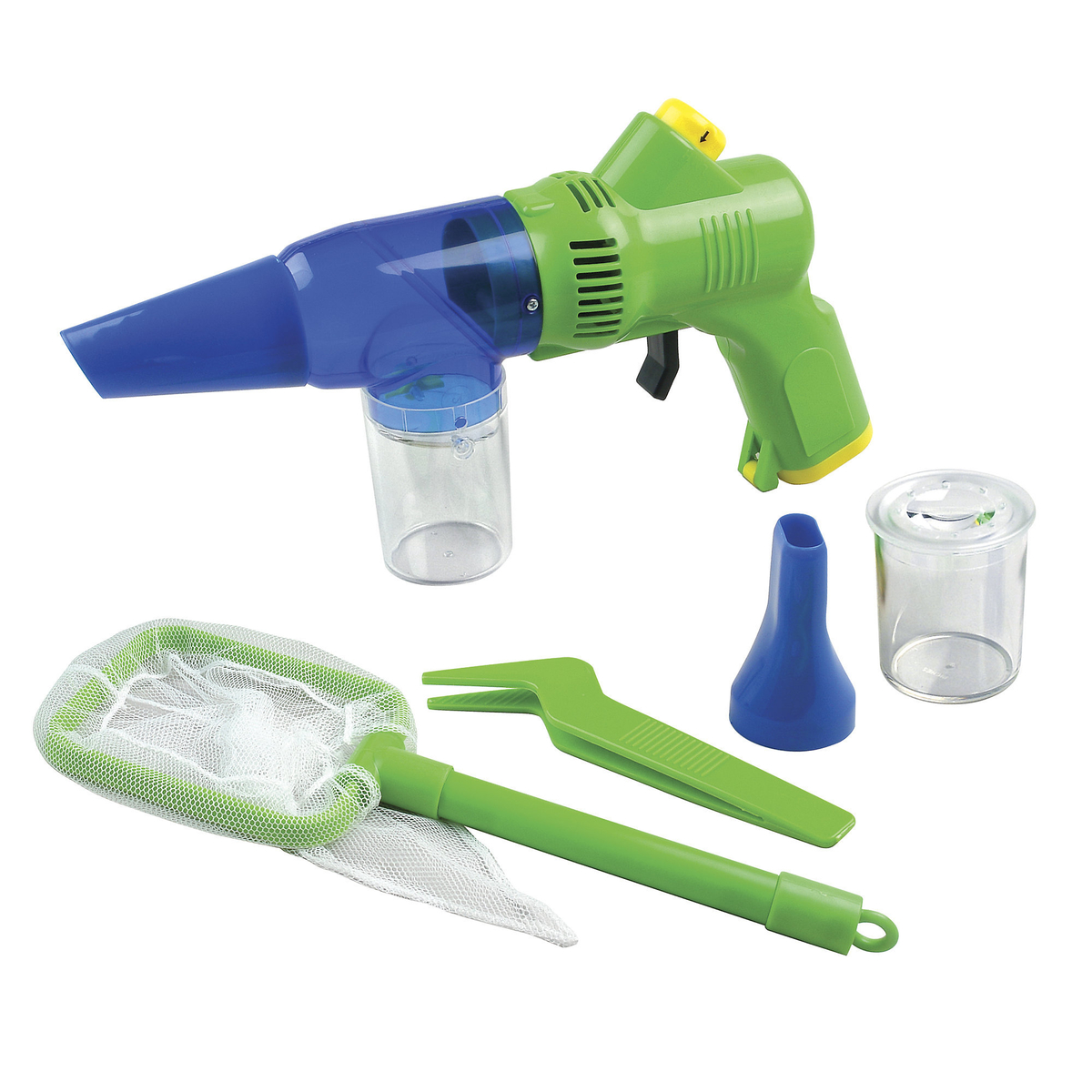 Two Way Bug Viewer, et glimrende startpunkt for unge entomologer som er interessert i insekter og sommerfugler. Settet omfatter en batteridrevet pistolformet småkrypsamler/bug collector som fungerer som en meget skånsom støvsuger og suger dyret inn i en liten plastboks som deretter forsegles fra siden (den er fortsatt ventilert). Småkrypsamleren har tre hastigheter og to ulike munnstykker. Settet inneholder dessuten en håv og en enklere pinsett. Småkrypsamleren er 29 cm lang og håven 28 cm lang. Alt er fremstilt i plast, og batterier følger ikke med. Husk å være snill og forsiktig med dyrene du fanger, og slipp dem ut når du er ferdig med å studere dem. Er du usikker på om et dyr kan bite eller stikke – la det være i fred. Fra 5 år.