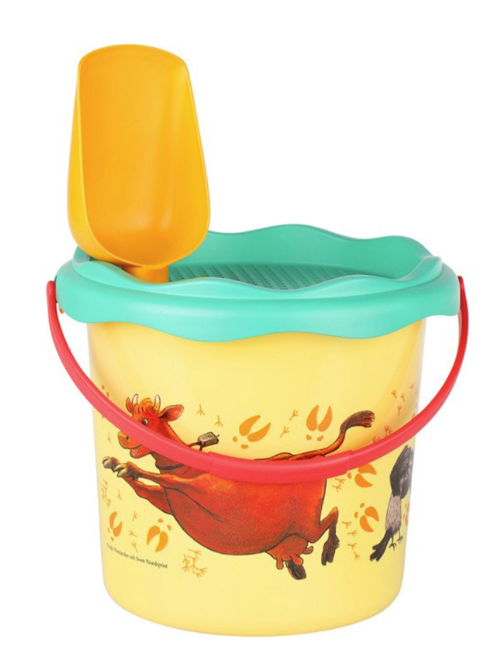 Plastbøtta har et praktisk bærehåndtak og silen har et hull som passer spaden. Bøttens diamater er 20cm.