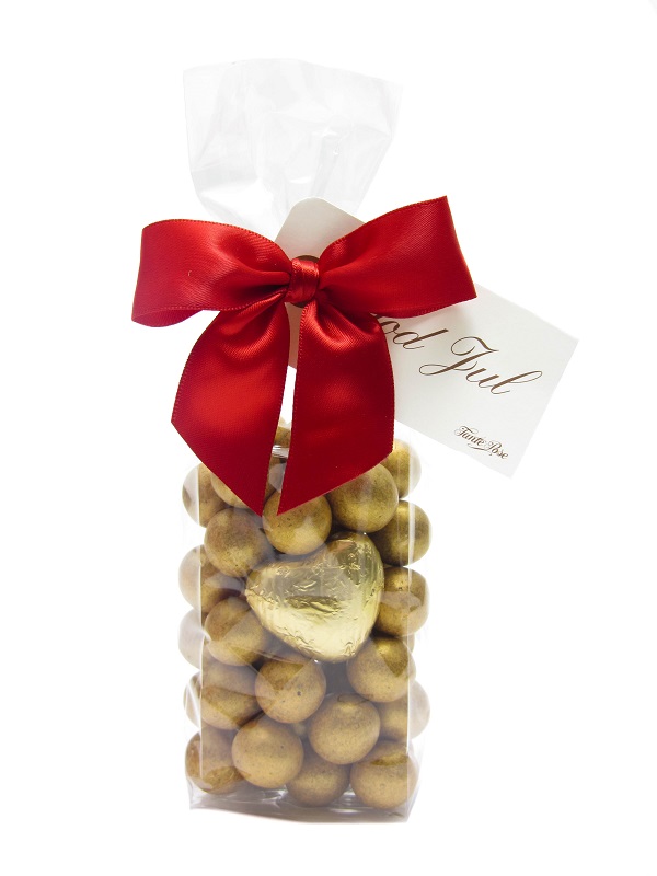 Gavepose med 100 gram Lakris Gull og Melkesjokoladehjerte.