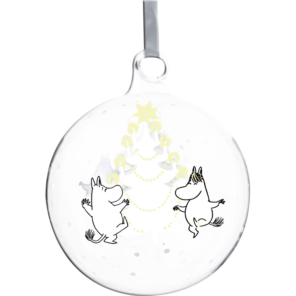 Dekorasjonskule i glass med satengbånd og motiv Mummitrollet og Snorkfrøken rundt juletreet.