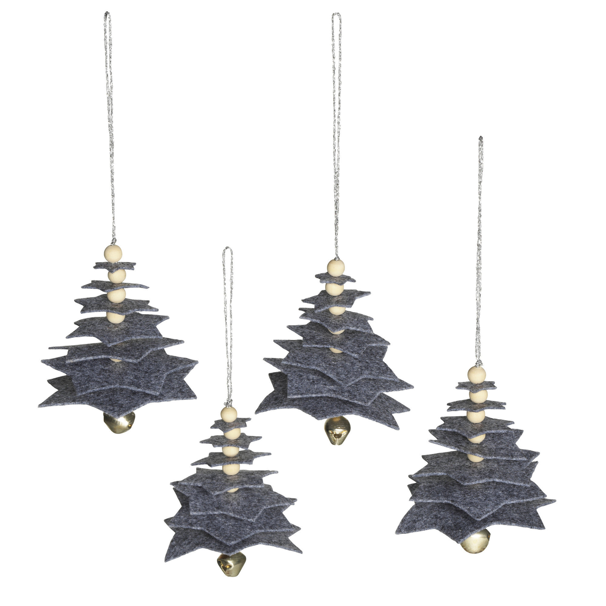 Dingle Dangle. Julehobby - klingende, dinglende juletrær, høyde ca. 8 cm. Innhold: Grå hobbyfilt, trekuler, bjeller, sølvtråd og nål samt veiledning. Materialer til 4 stk.