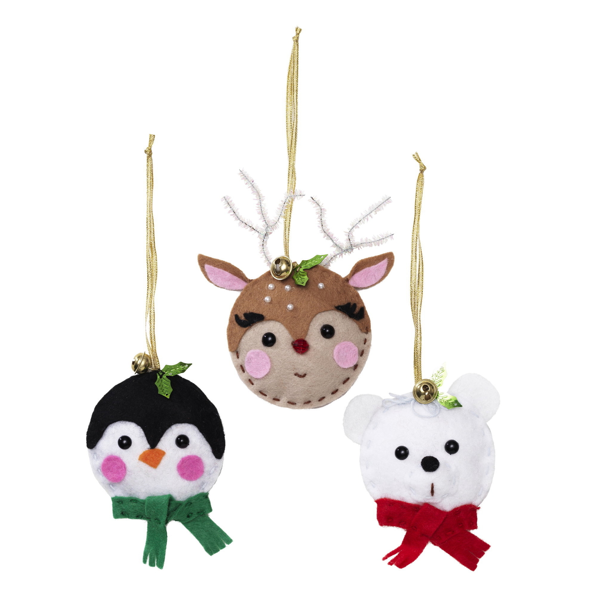De fineste filtanhengene i hele skogen, er det du får i dette morsomme DIY-kitet som blir til tre dyr – en pingvin, et reinsdyr og en isbjørn. Figurene er 8 cm i diameter (ører osv. er ikke medregnet). Fine å henge i juletreet eller fra kransen – eller hvorfor ikke som dekorasjon på en «ugly christmas sweater»? Kitet inneholder følgende: En mengde utstansede filtbiter i mange farger, øyne, neser, vatt, en mengde søte detaljer, gullfarget opphengssnor, sytråd og en ufarlig nål av plast. Og naturligvis en utførlig veiledning. Fra 6 år.