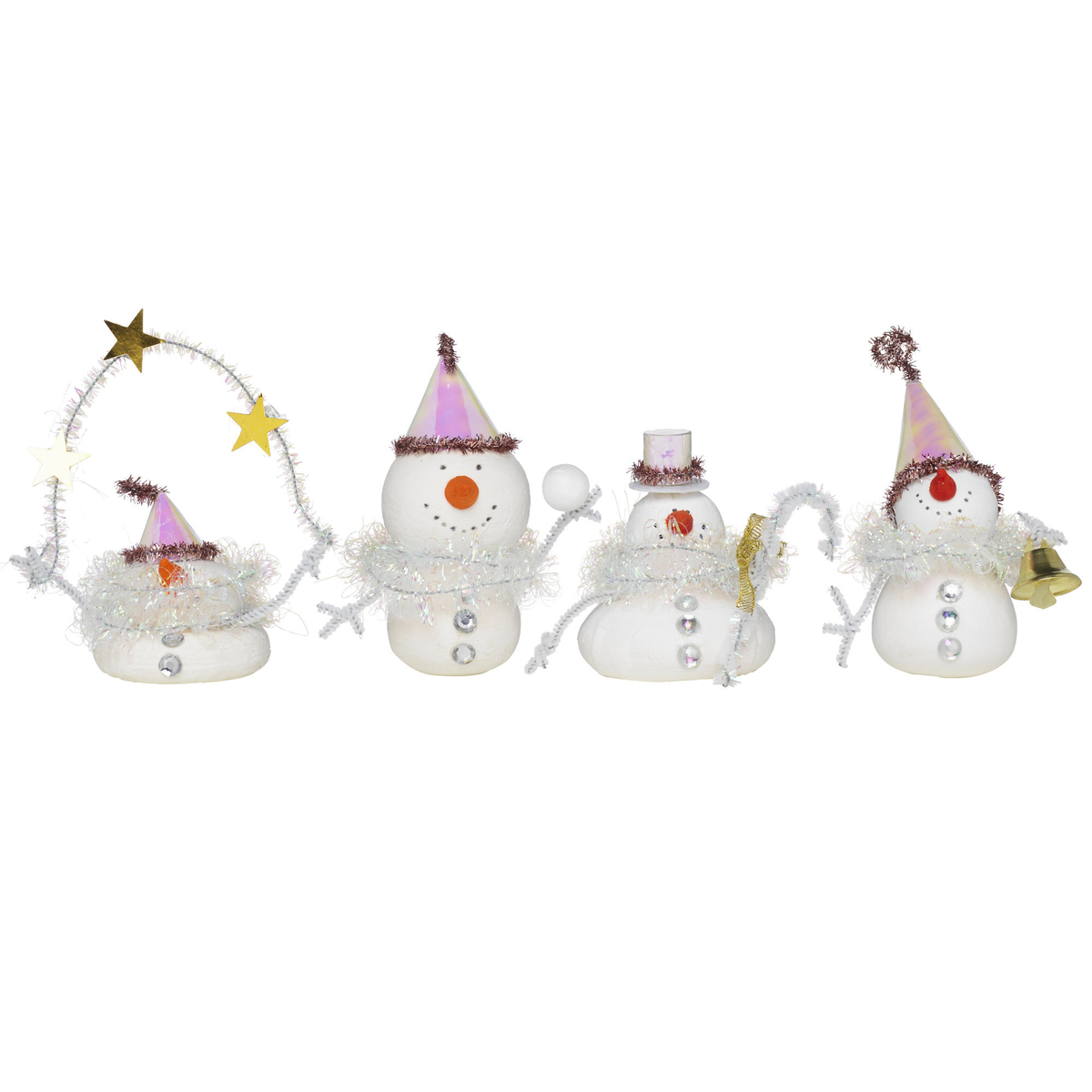 Glitzy Snowmen, julehobby for barn – lag en gjeng glade snømenn i partyhatter. Høyde ca. 7-10 cm. Innhold: Formpressede vattkuler, vattneser, hatt, dekorsteiner, paljetter, klokke, sløyfe, piperensere, svart penn, englehår, snøball, iriserende A6-ark samt veiledning. Husk å kjøpe lim i tillegg. Materiale til 4 stk. Fra 6 år.