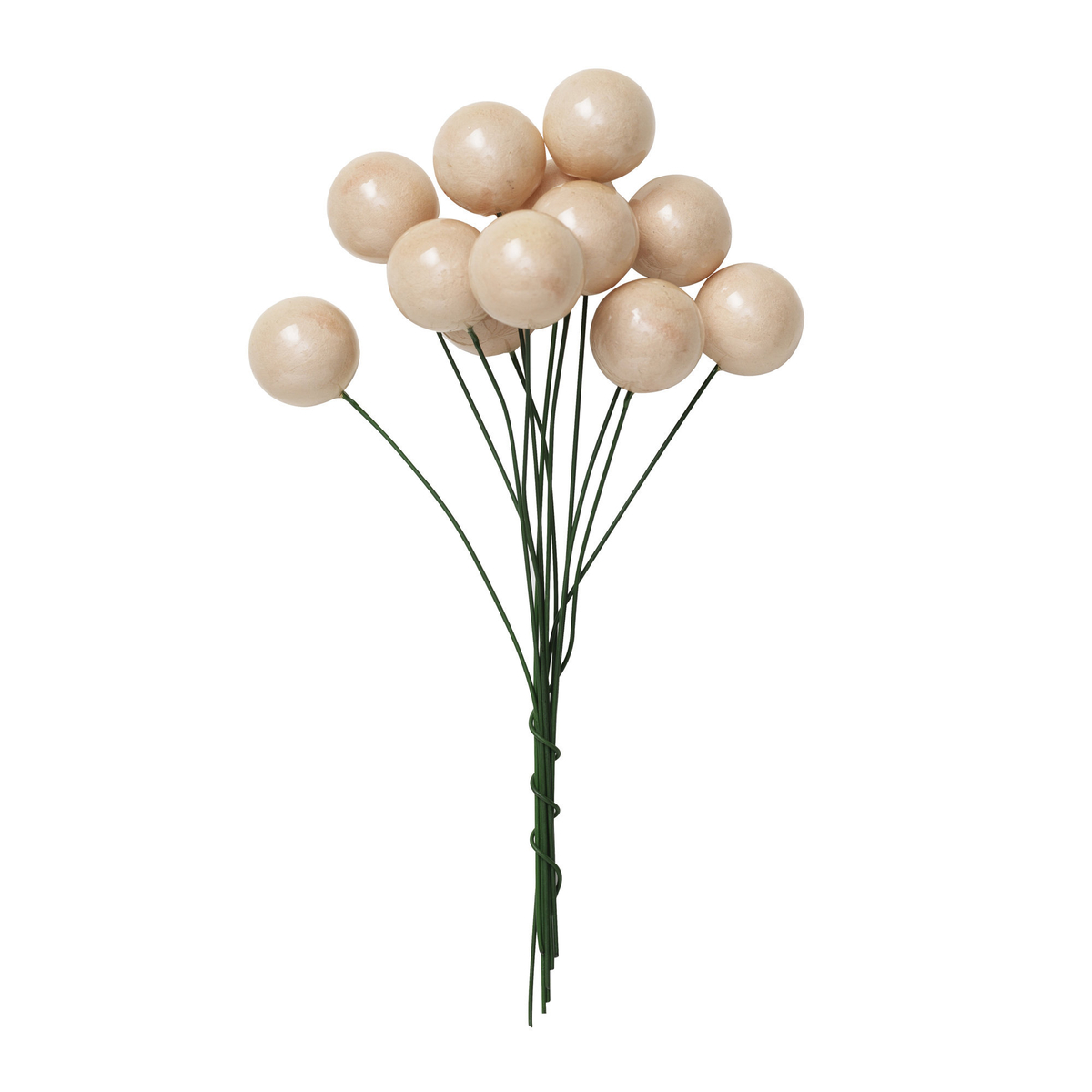 Dekorasjoner på metalltråd, små søte dekorasjoner på bøyelig metalltråd – vakre som pynt på blomster, julekranser, nissedører og pakker. Lengde cirka 15 cm. 12 stk. vattkuler lakkert i elfenbensfarge.