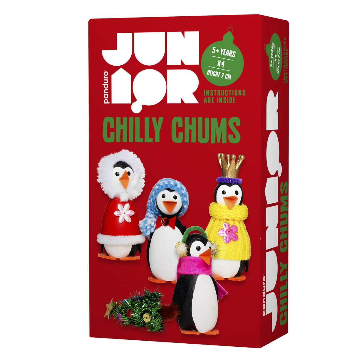 Chilly Chums, julehobby for barn – lag julens søteste pingviner. Høyde ca. 6-7,5 cm. Innhold: Trekropper, piperensere, maling, pensel, trepinner, paljetter, strikkestrømpe, filt, krone, pompong, nebb og garn samt veiledning. Husk å kjøpe lim i tillegg. Materiale til 4 stk. Fra 5 år.