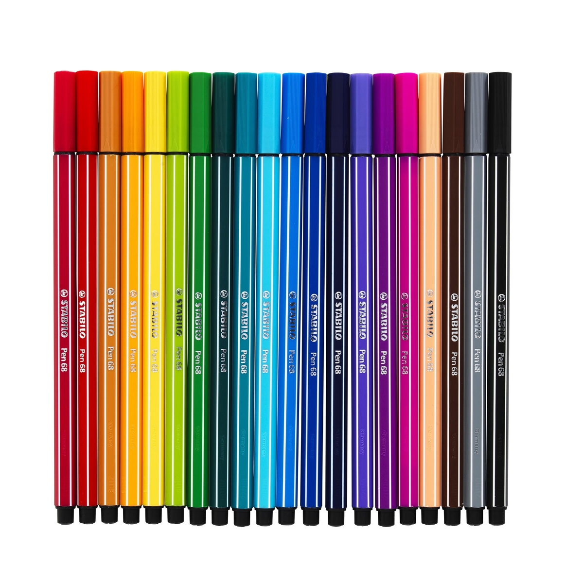 Stabilo Pen 68, tusjer med robust spiss på 1 mm, lengde 16,5 cm. Vannbasert blekk uten sterk duft. Stabilo 68 er litt av en kultpenn med intense farger av svært høy kvalitet. En annen stor fordel er hvor lenge de holder seg uten kork – hele 24 timer, noe som gjør dem spesielt populære blant de som liker malebøker for voksne hvor man hele tiden bytter farge mellom mange små felt. Basic, 20 farger. Color No: 55, 58, 26, 56, 50, 48, 54, 44, 33, 36, 53, 51, 57, 41, 32, 22, 89, 45, 96, 46.