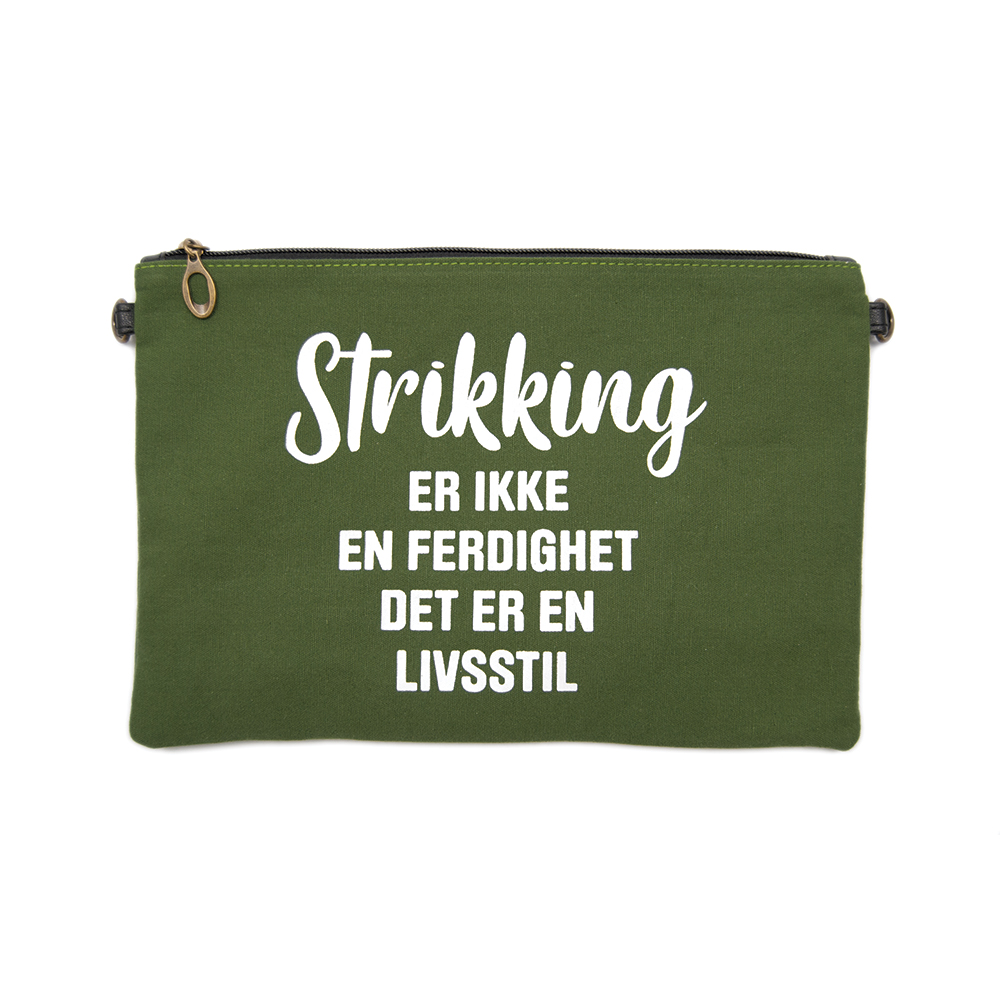 Liten veske av stoff, med reim som kan tas av og på. Fin til å ha strikkepinner, synåler, saks, målebånd, maskemarkører mm. oppi. Strikking er ikke en ferdighet det er en livsstil