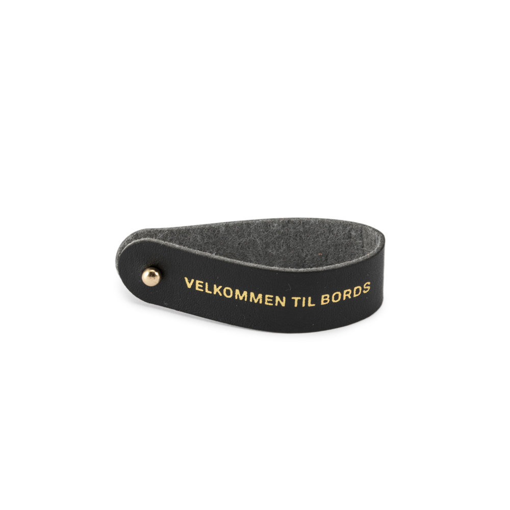 Kunstskinn i svart farge med diskre knapp i gullfarge, tekst "Velkommen til bords"