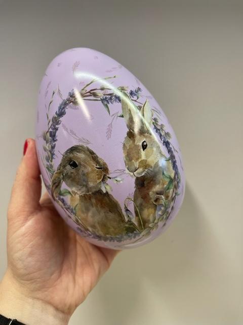Påskeegget er laget i tinn og kan tas frem år etter år. Det er og nydelig som dekor. Kan åpnes og legges godteri i! Håndvask, tørkes grundig.