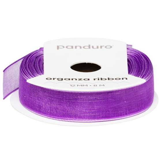 Panduro Organza Ribbon er en serie organzabånd som blir en perfekt detalj for gaveinnpakning, kranser, bordpynt, sløyfer, blomsterbuketter, hobbyarbeid og DIY generelt. Båndet er flortynt og semitransparent på grunn av den meget fine strukturen i det fine rutenettet. Rullen inneholder 8 meter, og båndet er 12 mm bredt. Fremstilt i 100 % nylon. Skånsom håndvask. Lilla