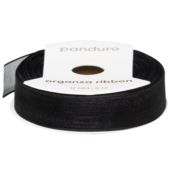 Panduro Organza Ribbon er en serie organzabånd som blir en perfekt detalj for gaveinnpakning, kranser, bordpynt, sløyfer, blomsterbuketter, hobbyarbeid og DIY generelt. Båndet er flortynt og semitransparent på grunn av den meget fine strukturen i det fine rutenettet. Rullen inneholder 8 meter, og båndet er 12 mm bredt. Fremstilt i 100 % nylon. Skånsom håndvask. Svart