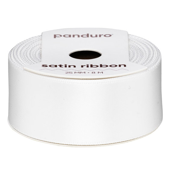 Panduro Satin Ribbon er en omfattende serie flotte dobbeltsidige satengbånd som finnes i mange farger og forskjellige bredder. Båndene er myke og glansfulle – en perfekt detalj for gaveinnpakning, kranser, bordpynt, sløyfer, blomsterbuketter, hobbyarbeid og DIY generelt. Virkelig det lille ekstra som gir det meste et løft. Rullen inneholder 8 meter, og båndet er 25 mm bredt. Fremstilt i 100 % polyester. Tåler å vaskes på 40 °C. Hvitt satengbånd – 25 mm bredt og 8 meter langt