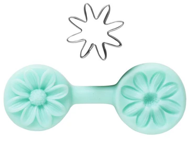 Sugarflex kit, blomst/blad ca. Ø 30 mm. Verktøy for perfekte blomster med både over- og underside, av sukkerpasta eller marsipan. SLIK GJØR DU: Kjevle ut sukkerpasta eller marsipan, stans ut en figur og legg den midt i den ene delen av silikonformen. Press sammen med et lett trykk, åpne og blomsten er ferdig med både over- og underside. I vårt sortiment har vi både sukkerpasta og marsipan i mange farger. Pris pr. sett. Daisy