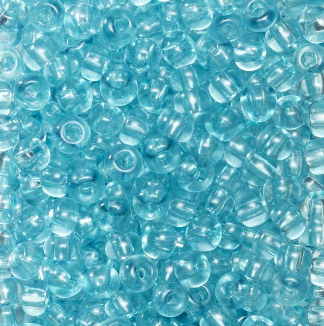 Rocaillesperler (6/0), av glass (preciosa), kalles også for seed beads. Dekorative perler som fås i mange lekre farger. Vakre å bruke både som detaljer eller som hovedmateriale i halskjeder, armbånd, mobilpynt m.m. Også perfekte å bruke i perlevev og dekorative å brodere med på f.eks. puter og vesker. Perlene er produsert i Europa i henhold til tradisjonell teknikk som garanterer høy kvalitet, størrelse Ø 3,7–4,3 mm. Hull ca. 1 mm. Innhold 30 g, ca. 390 stk. - Lys aqua/marine transparent
