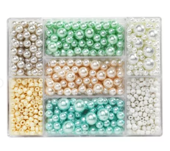 Perlemiks pastell, av glass. Ø 4, 6, 8 og 10 mm, hull ca. 0,8–1,5 mm. Leveres i en plasteske med 7 rom, 9x12 cm. Pakke med ca. 800 stk.