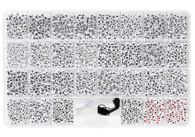 Mega letter beads kit er virkelig m-m-me-me-mega-mange bokstavperler! Kitet inneholder hele 3000 perler fordelt på bokstavene A-Z samt to rom med Å, Ä, Ö, Æ og Ø. Så plasserte vi to rom over der igjen – fylt med perler med røde hjerter på! Det blir rundt 100 perler i hvert rom. To elastiske smykketråder i hvitt og svart er også inkludert. Perlene er 7 mm i diameter og har en hulldiameter på 1 mm – det vil kort og godt si at hvis du trær alle perlene på en snor, blir det cirka 21 meter langt – hvilken sang tenker du å hente inspirasjon fra til et herlig langt armbånd eller halskjede? Laget av plast. Fra 5 år.
