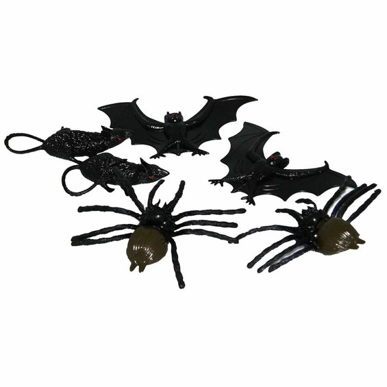 Stygge og ekle dyr til Halloween-dekorasjon! Eller året rundt hvis du er i det humøret. Pakken inneholder 6 dyr av svart plast – 2 rotter, 2 flaggermus og 2 edderkopper. Høres ikke det som noe fint å pynte med før den uhyggelige Halloween-festen?