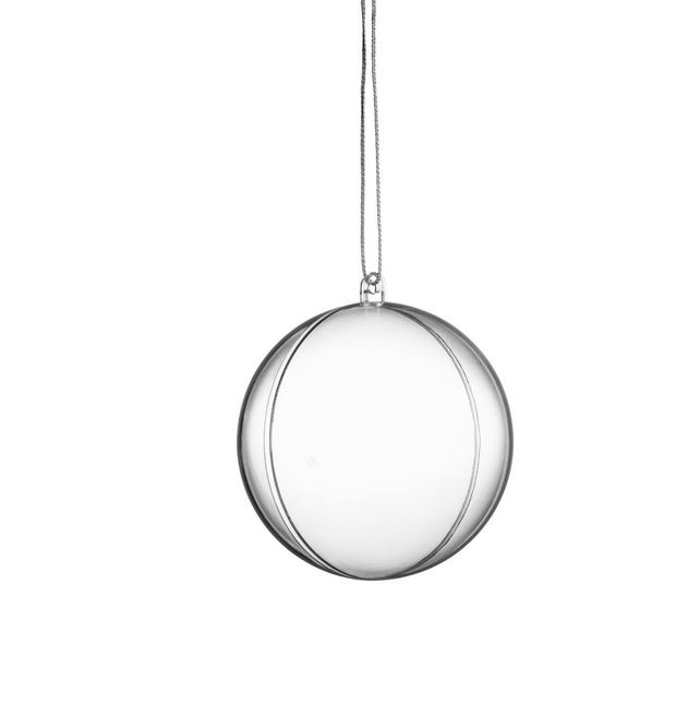 Delbar juletrepynt med skillevegg, av klar akryl. Denne serien med julekuler og julepynt er delbare og har en skillevegg (uttakbar). Selv vanlige julekuler osv. er morsomme og overlater mye til kreativiteten – men her tar vi det hele ett skritt lenger! Mal med vakre mønstre og fyll med ting! Tenk deg en julekule med halvparten dyppet/malt i rødmaling nederst, dekorert med sirlige mønstre av en gullfarget metallicpenn og fylt med kongler over kanten der malingen slutter. Fyll f.eks. en halvdel med mel, sett ned en liten grankvist, sett halvdelene sammen og vips – du har et vinterlandskap i en julekule. Lag små presanger av papir og kartong og fyll! Har du lite fantasi? Legg godteri i dekorasjonene – det funker alltid! Pris per stk. Kule Ø 8 cm