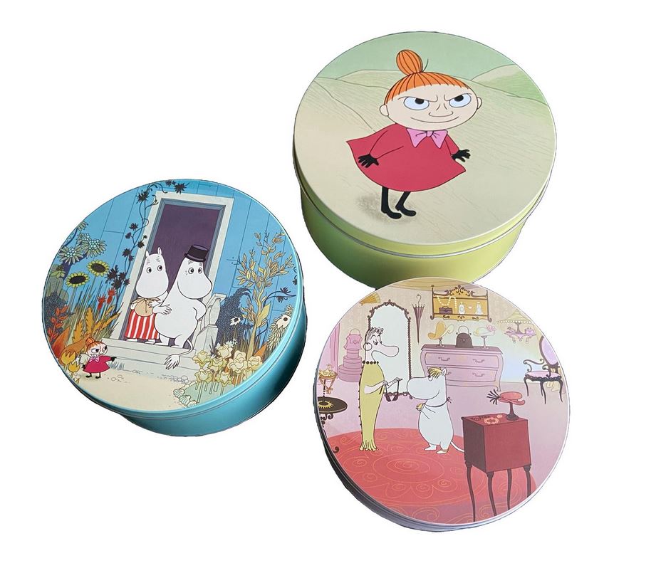 Dekorative og søte Mummi kakebokser med motiv av Lille My, I døren og Snorkfrøken. Boksene er i tinn fra vår egenproduserte kolleksjon. Boksene er fine til knekkebrød, kaker, småsaker – eller hva du måtte ønske. Fine hjemme og supre til å gi bort i gave. Med eller uten noe i. Håndvask og grundig tørking anbefales.