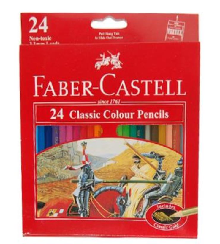 Klassiske fargeblyanter fra kvalitetsmerket Faber Castell! Pakken inneholder 1 blyantspisser og 24 stykk fargeblyanter, inkludert fargen Gull. Blyantene er laget av økologisk produsert tre. Esken måler: ca 18cm x 18cm.