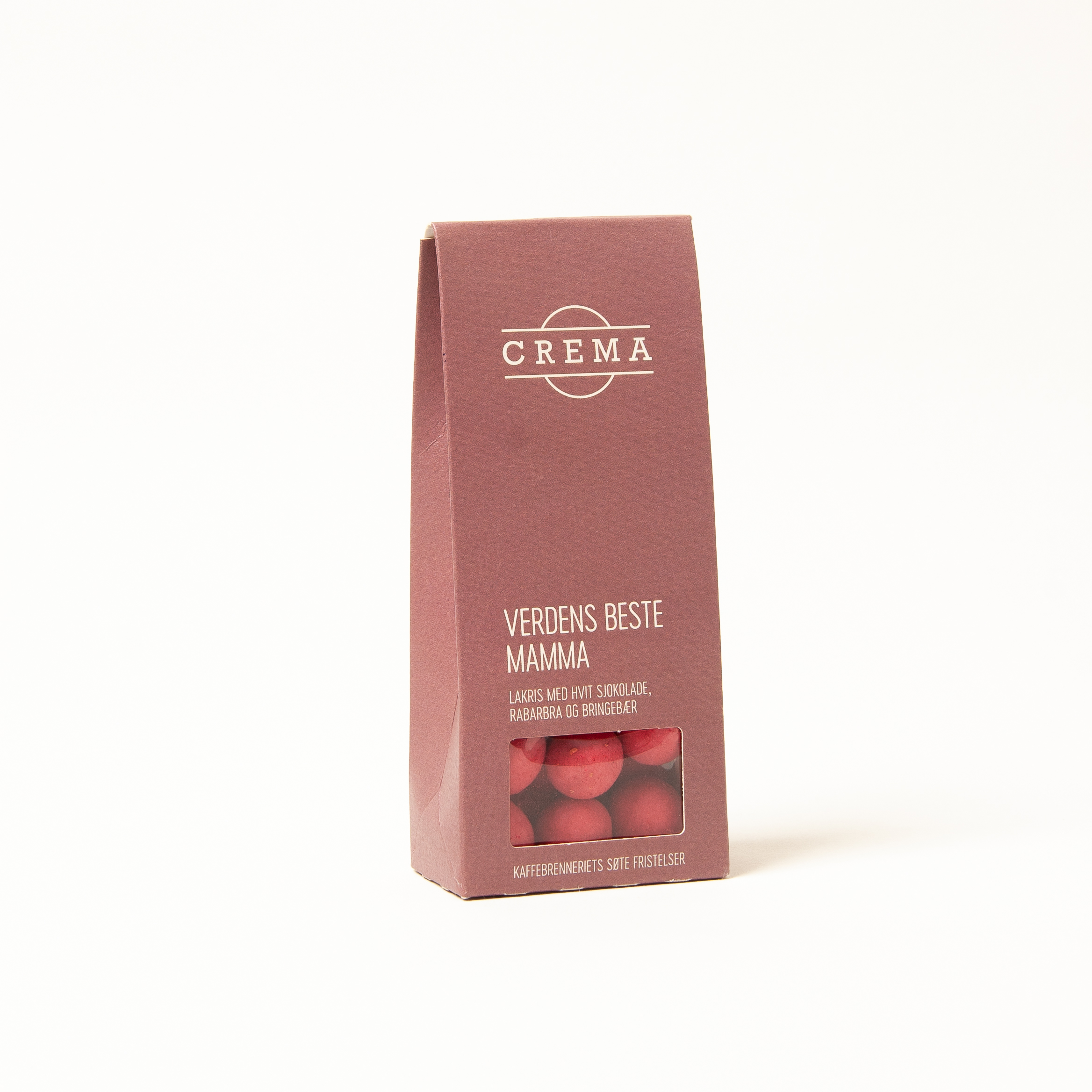 Ingredienser: Sukker, kakaosmør, melkepulver, sirup, maismel, invertsukker, lakris (1,7 %), salt, frysetørret bringebær, sitronsyre, aroma (vanilje, rabarbra), stabilisator (E420), konserveringsmiddel (E202), emulgator (E322 soyalecitin), fargestoff (E100, E120), overflatebehandlingsmiddel (kokosolje, E903)