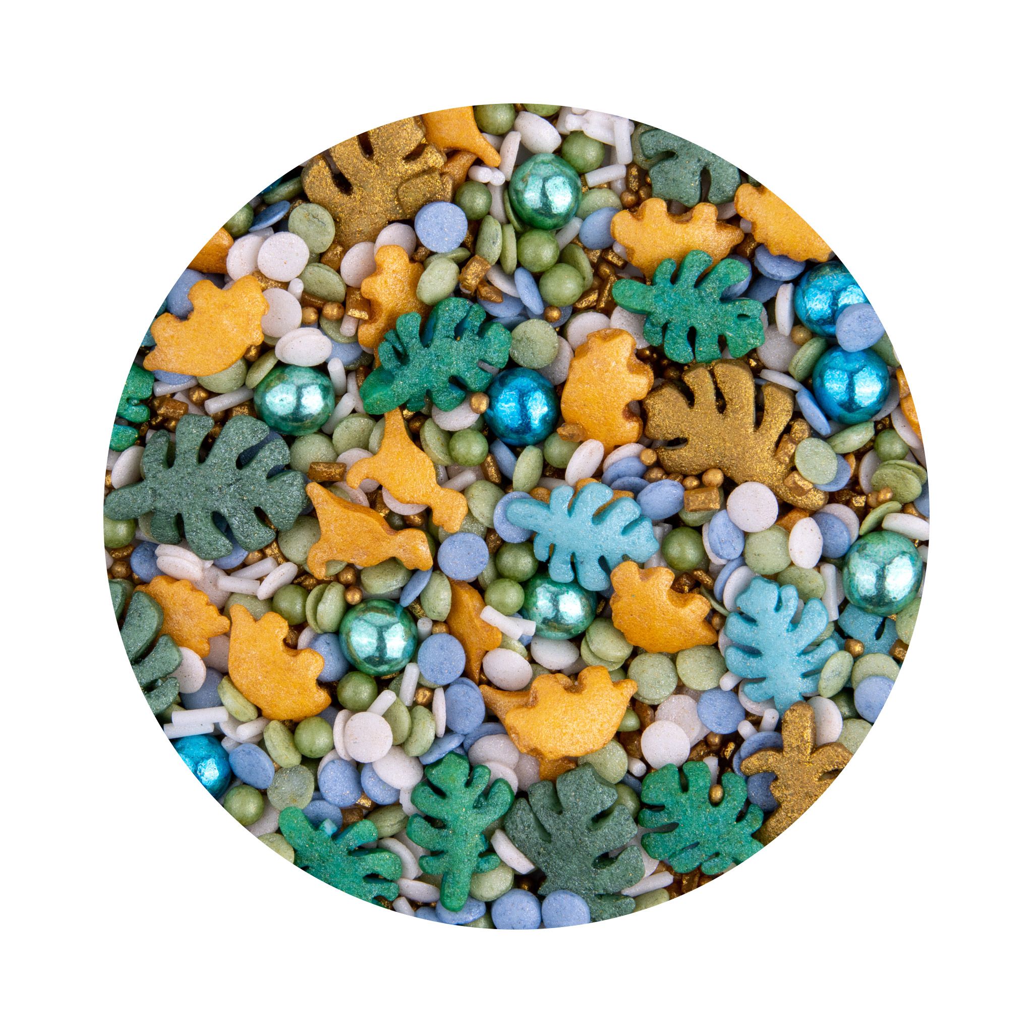 Miksen består av strø formet som dinosaurer, blader, perler, confetti m.m. i nydelige blå og grønne toner.