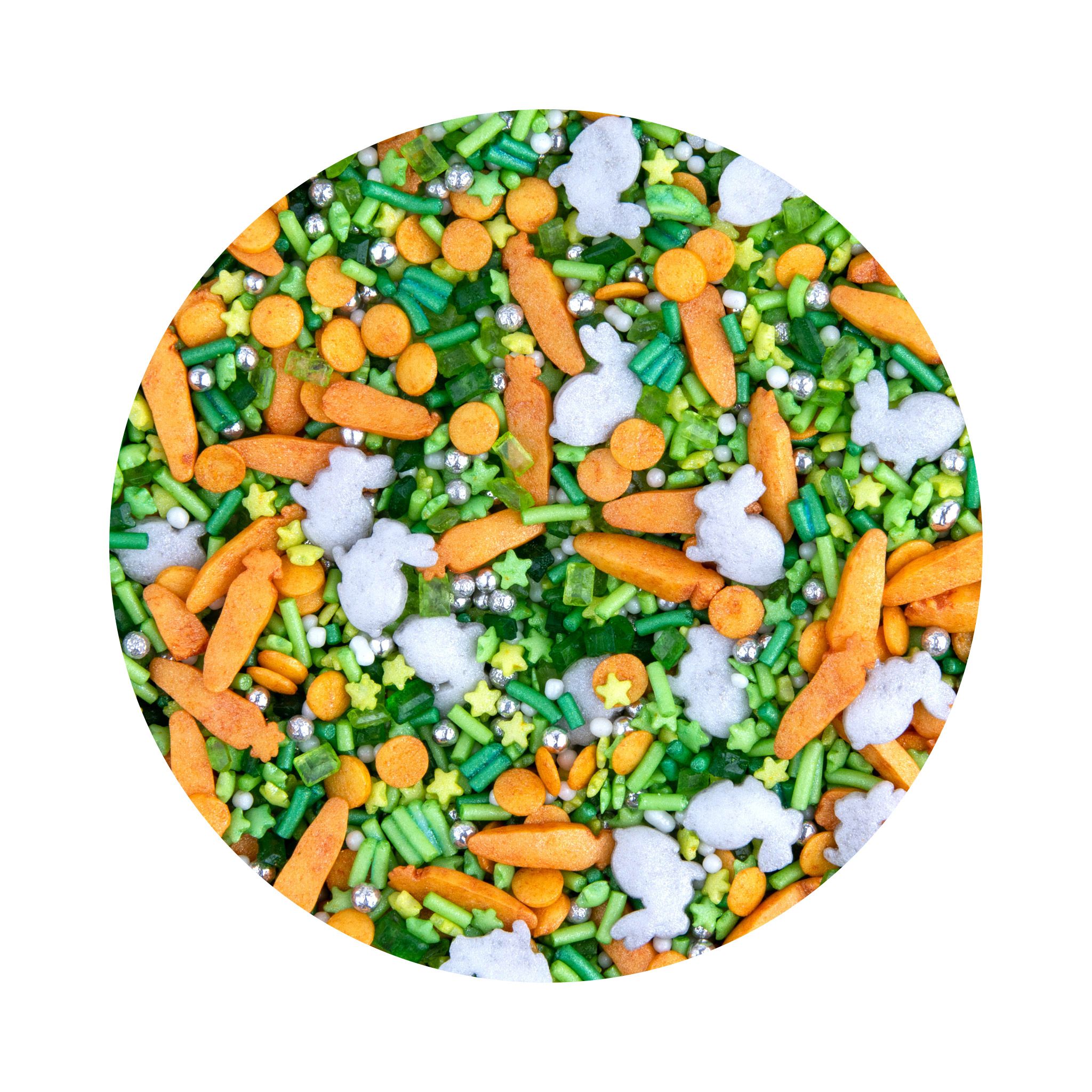 Miksen består av strø som passer perfekt til gulrotkaken og inneholder kaniner, perler, gulrøtter, vermicelli m.m. i friske farger.