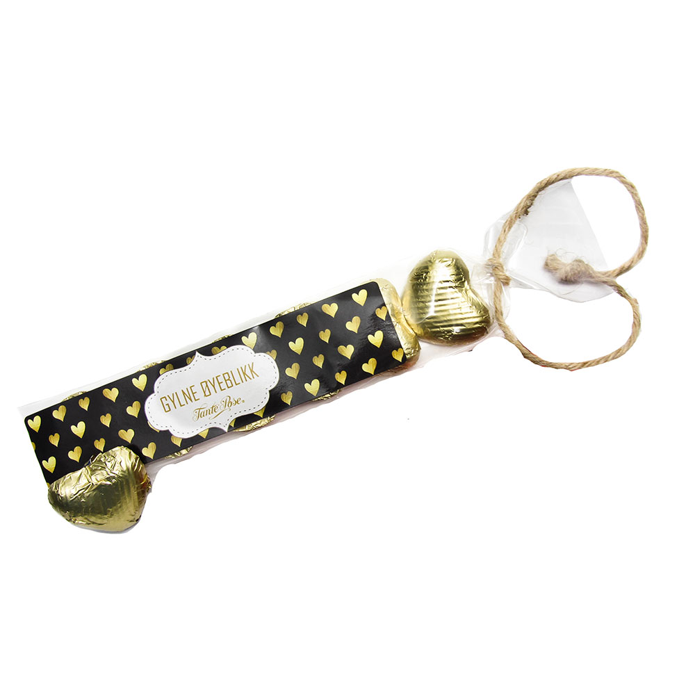 Gavepose med 30 gram Melkesjokoladehjerter (Fairtrade). Minst 33% kakao.