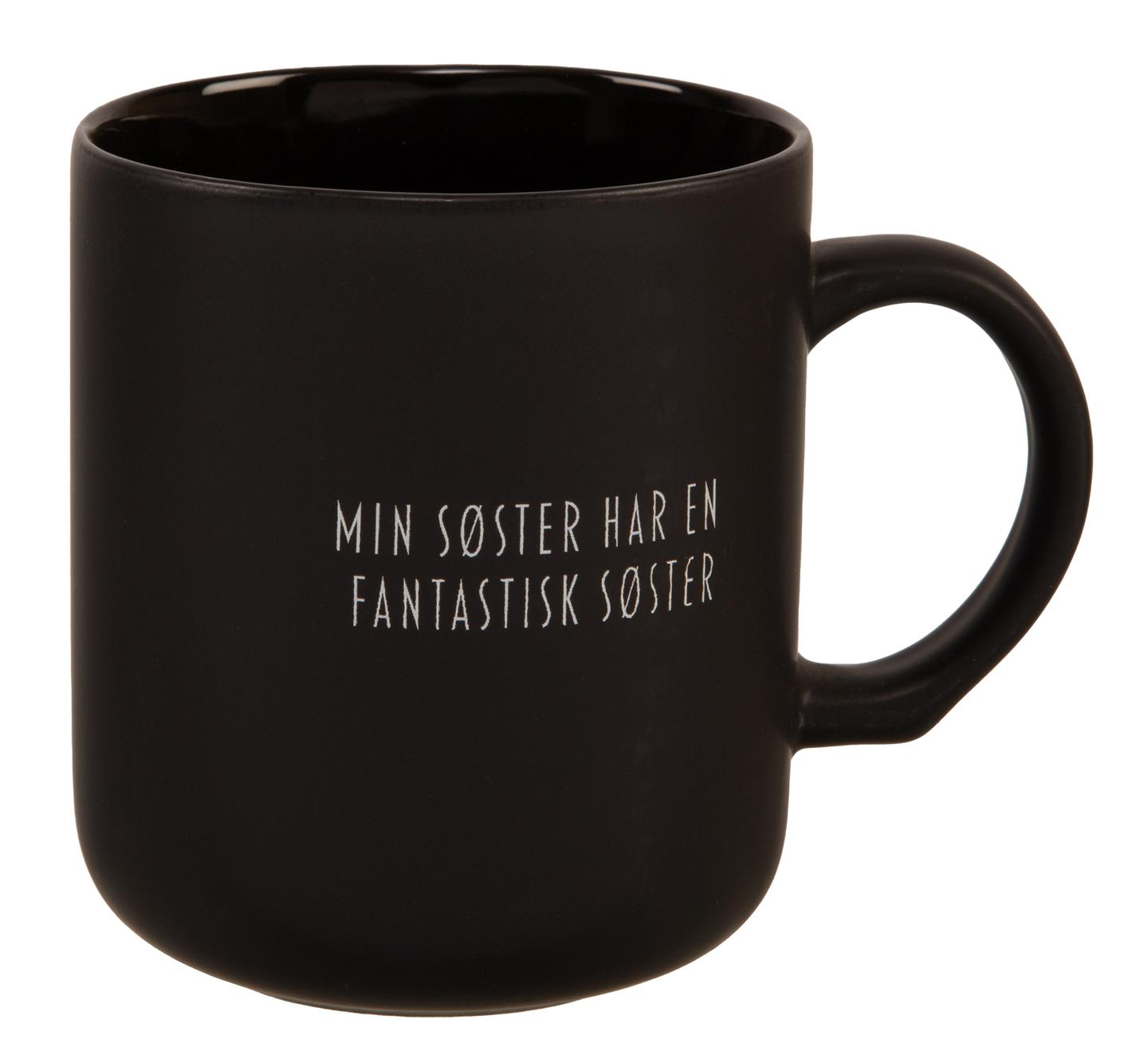 Sort krus med hvit tekst "Min søster har en fantastisk søster"