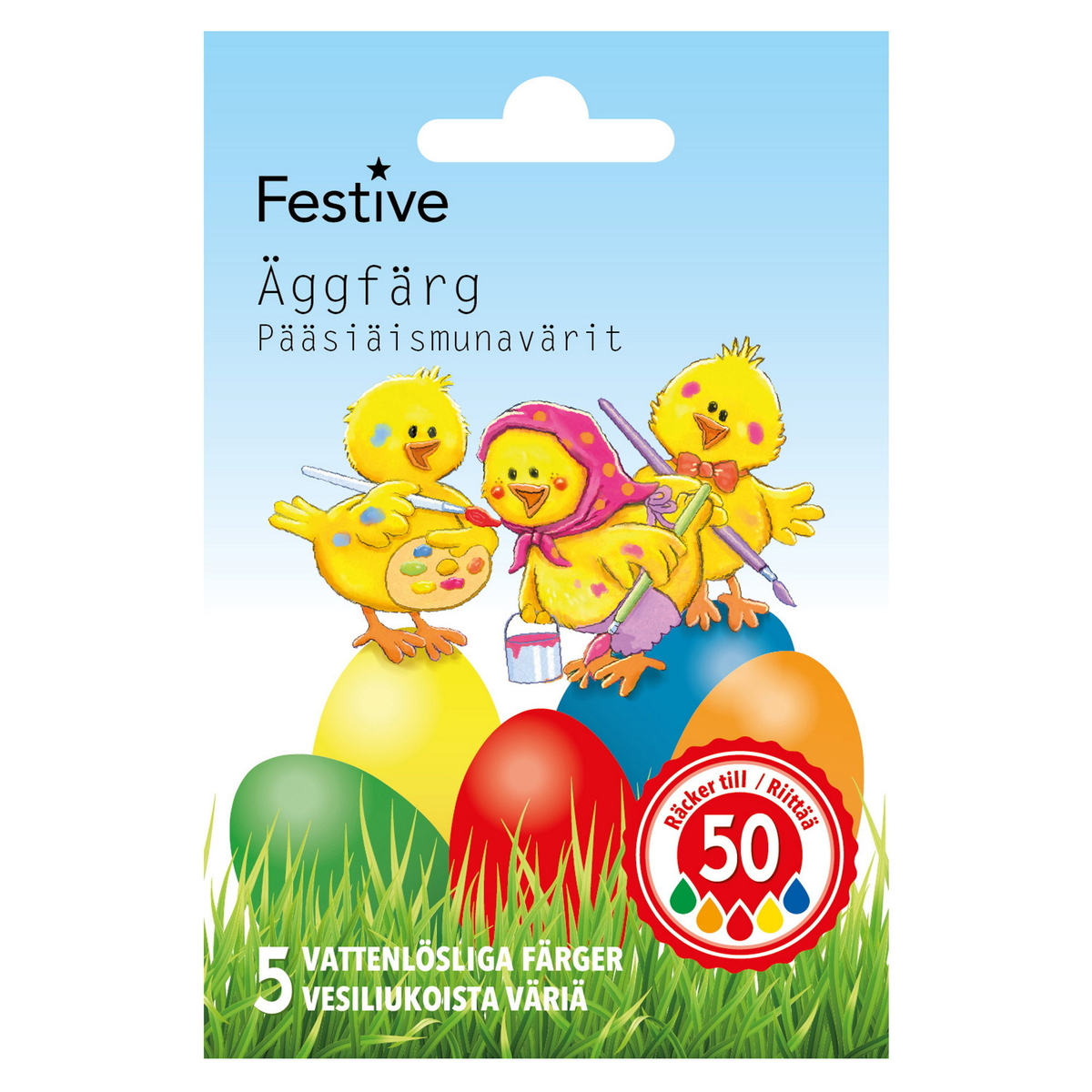 5 stk. eggfargetabletter for å gi påskeeggene flotte farger! Nydelige dekorasjoner til bordet eller i et påskeris. Pakken inneholder fem farger: Rød, oransje, blå, grønn og gul. Holder til 50 egg av normal størrelse. Næringsmiddelgodkjent.