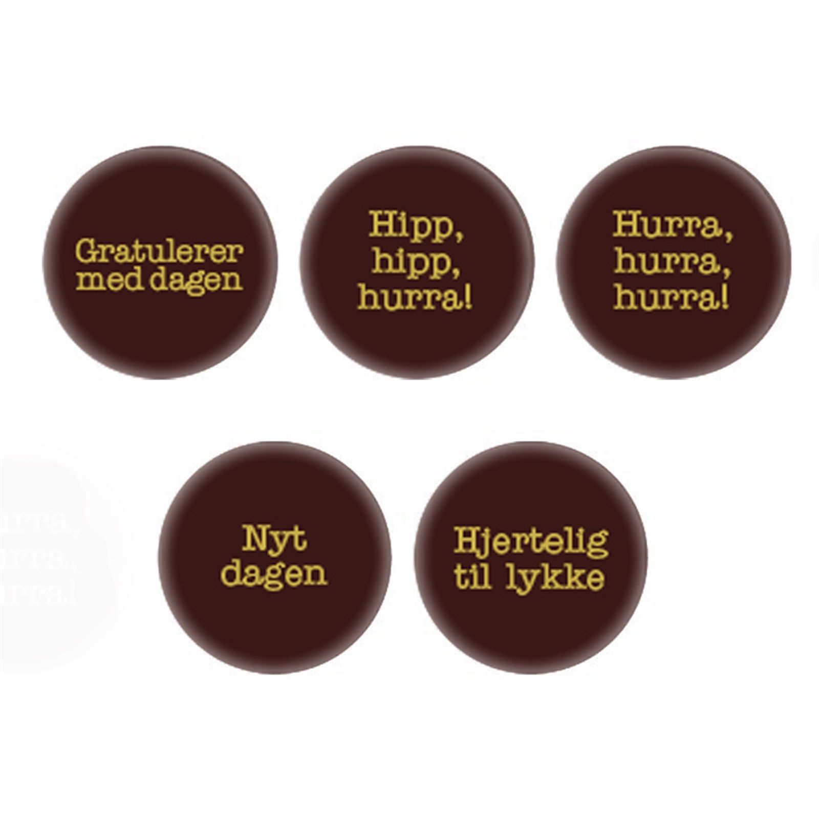 Skiltene har ulik tekst: Gratulerer med dagen / Hipp, hipp, hurra! / Hurra, hurra, hurra! / Nyt dagen / Hjertelig til lykke.